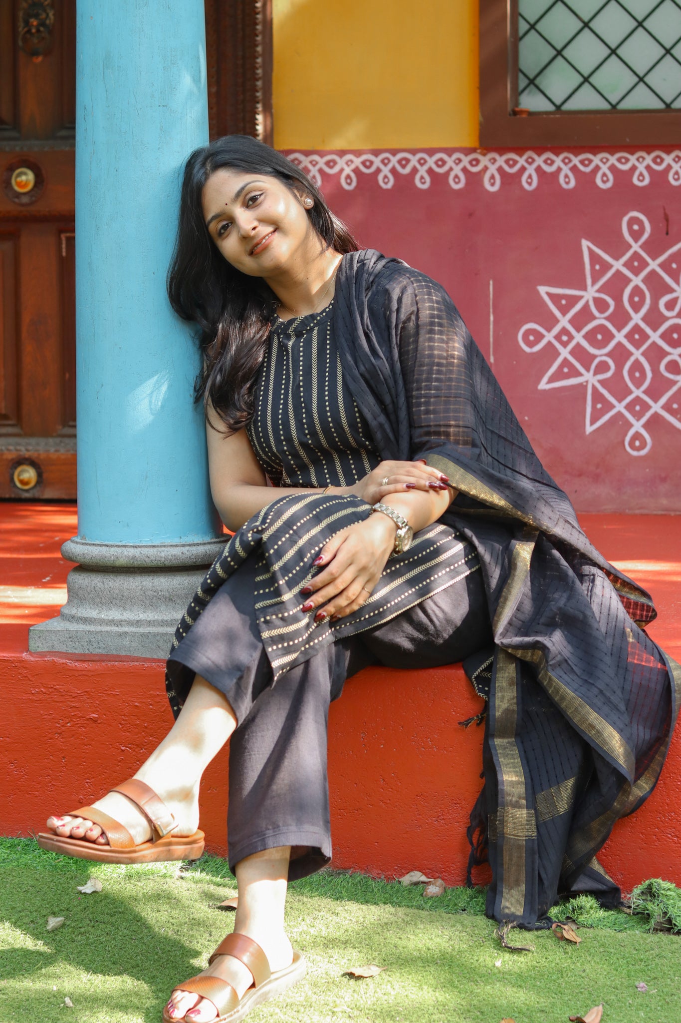 Black striped pure cotton handloom women kurta set (sleeves attached)