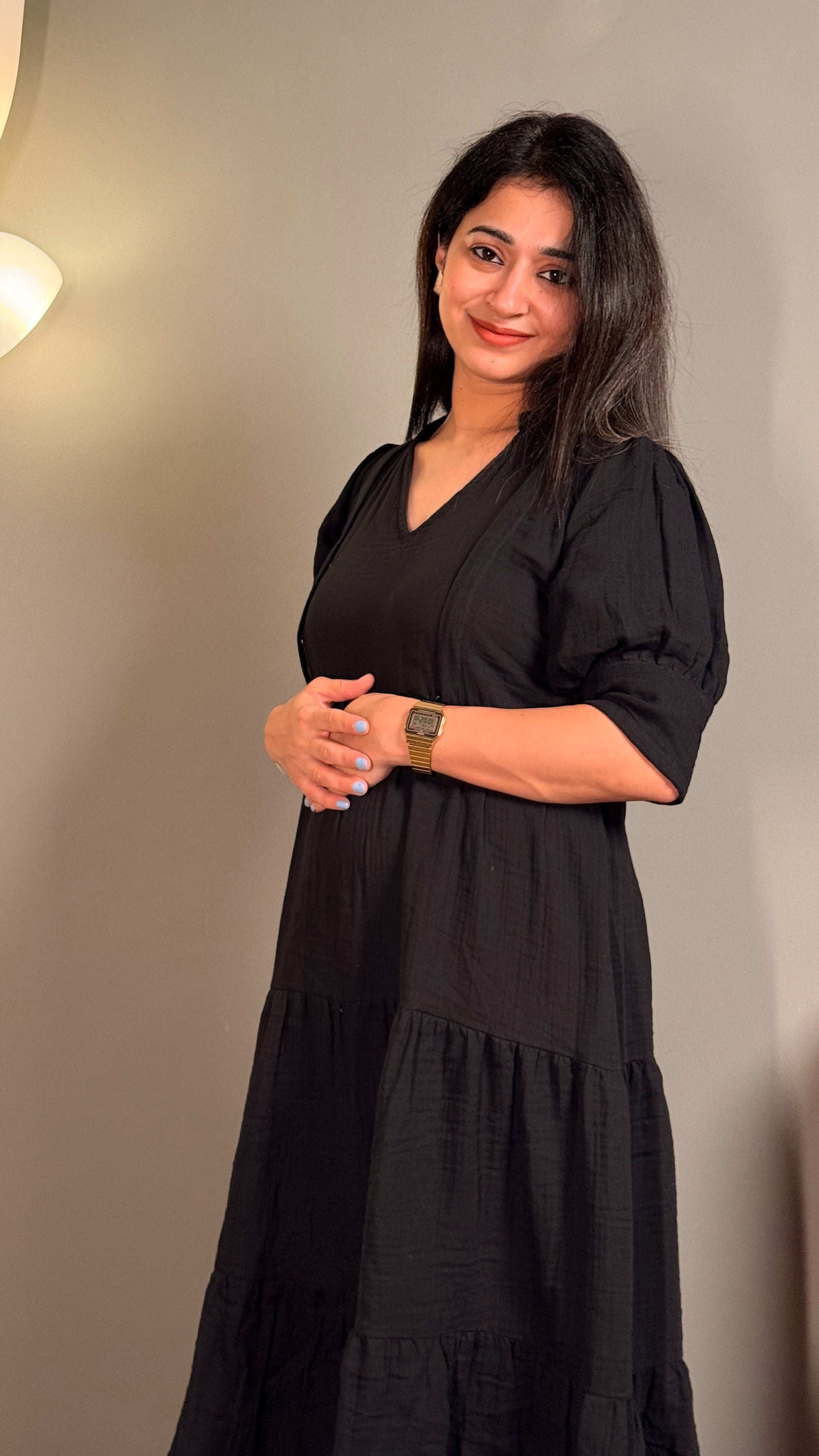 This black muslin cotton maternity maxi is designed for comfort and practicality throughout pregnancy and nursing. Made from soft, breathable fabric, it provides gentle support and ease of movement. The discreet feeding zipper allows convenient breastfeeding without compromising style, making it an expert choice for mothers seeking both functionality and elegance in one garment.
