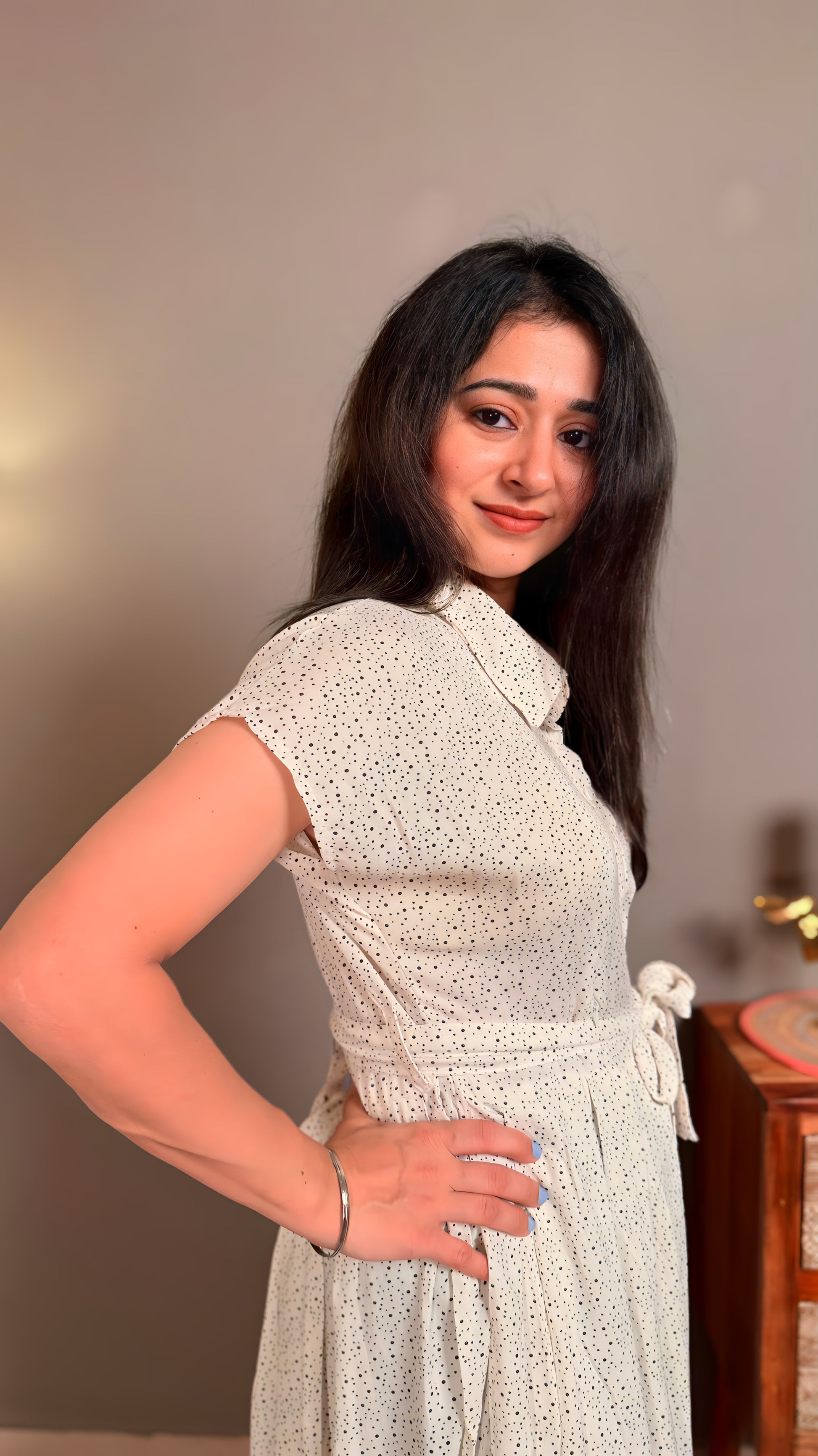 This black and white polka dot maternity maxi dress is crafted from soft cotton, providing comfortable breathability throughout pregnancy. Its flowing design accommodates changing body shapes, while the classic dotted pattern adds timeless elegance. Ideal for everyday wear or special occasions, it balances style and comfort effortlessly for expecting mothers.