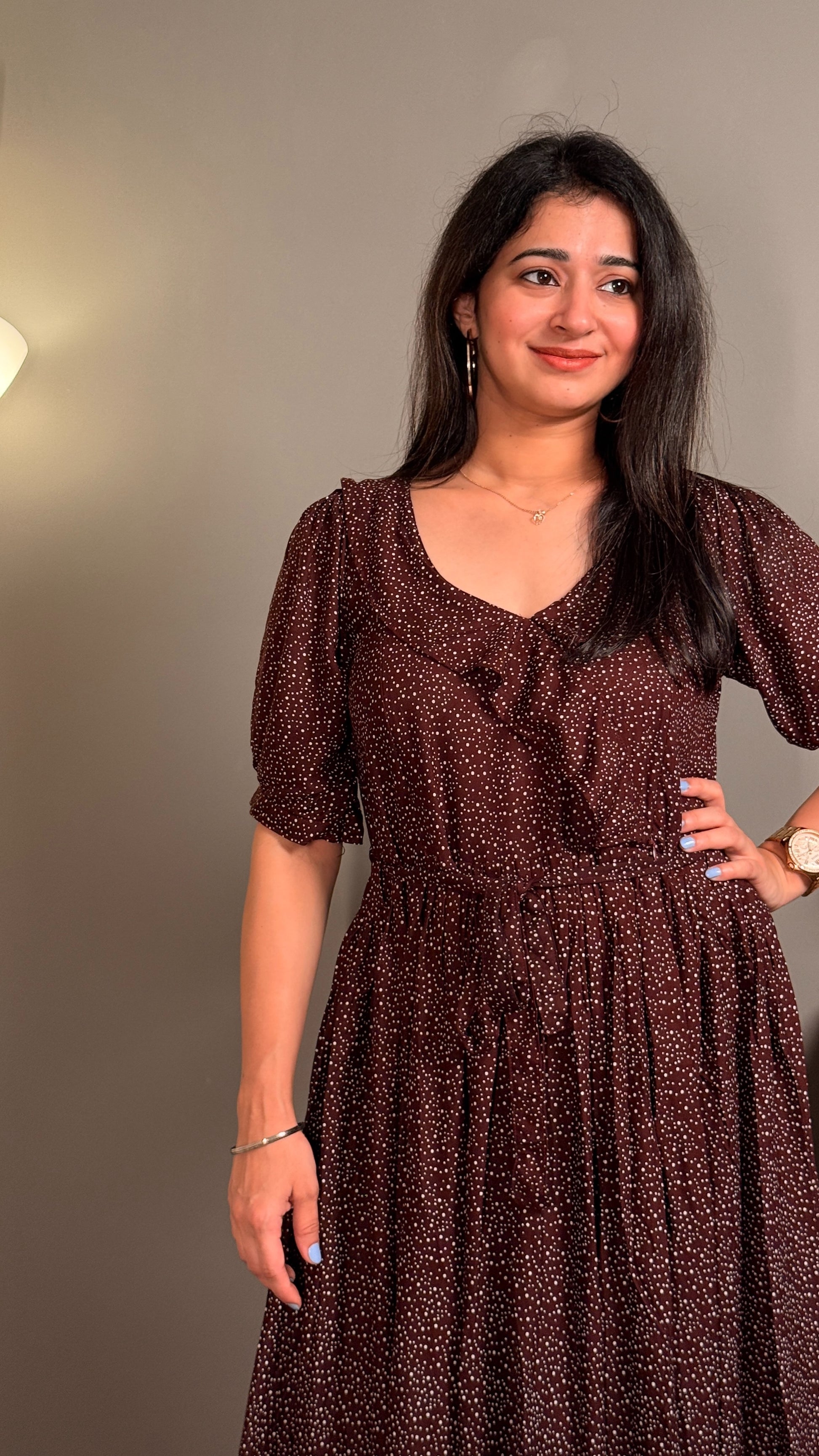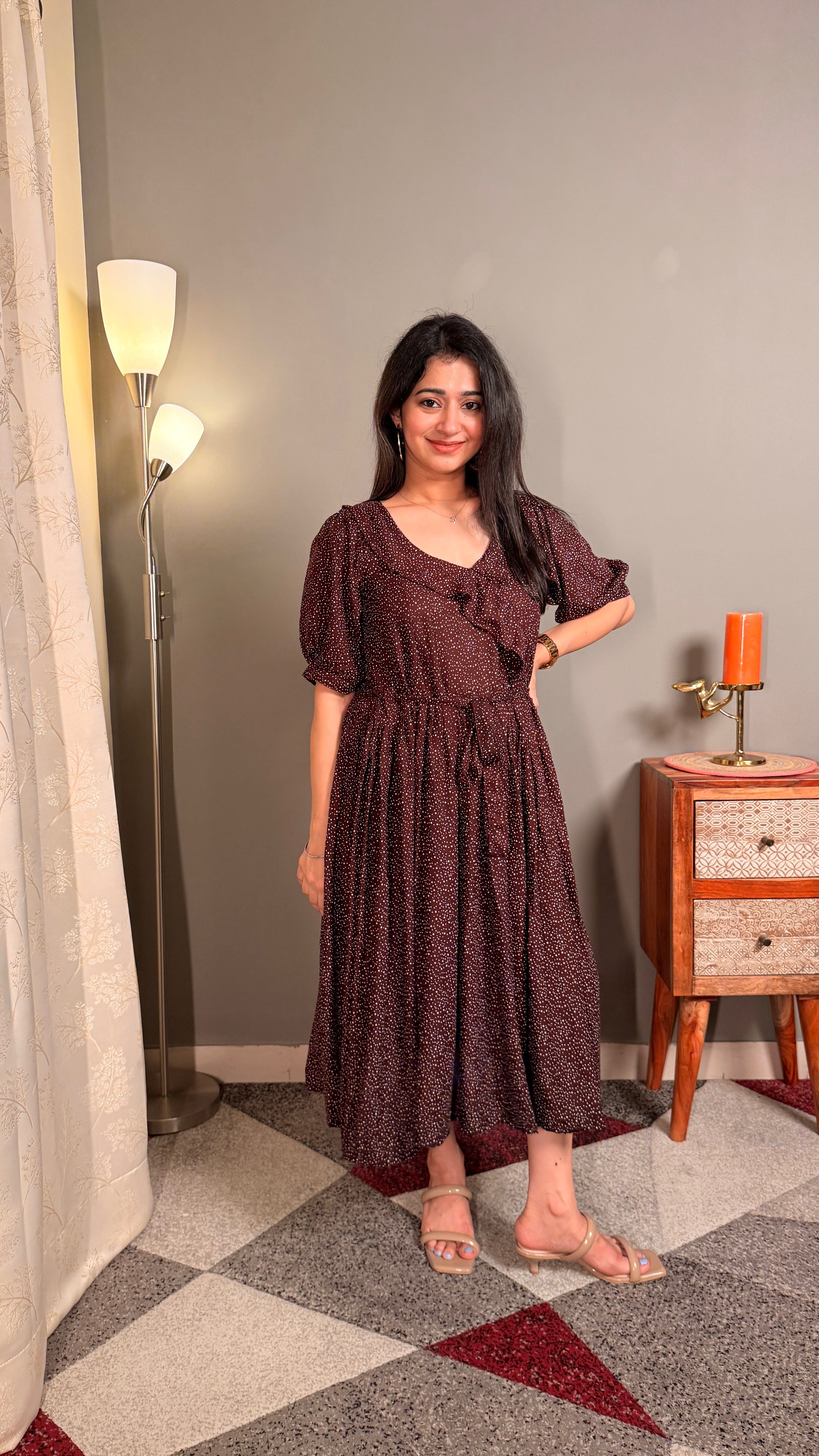 Crafted from breathable cotton, this brown dotted maternity maxi offers comfort and style for expectant mothers. Its soft fabric ensures gentle wear on sensitive skin, while the flowing maxi design accommodates a growing belly without compromising on elegance. Ideal for daily wear or special occasions, this dress combines practicality with timeless appeal to support you throughout your pregnancy.
