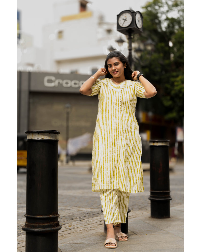 Experience the perfect blend of comfort and style with these cream and green striped co-ord sets crafted from pure cotton. Designed for breathability and softness, this set ensures all-day comfort while the classic striped pattern adds a refined, timeless appeal. Ideal for casual outings or relaxed workdays, it offers effortless coordination and a polished look with minimal effort.