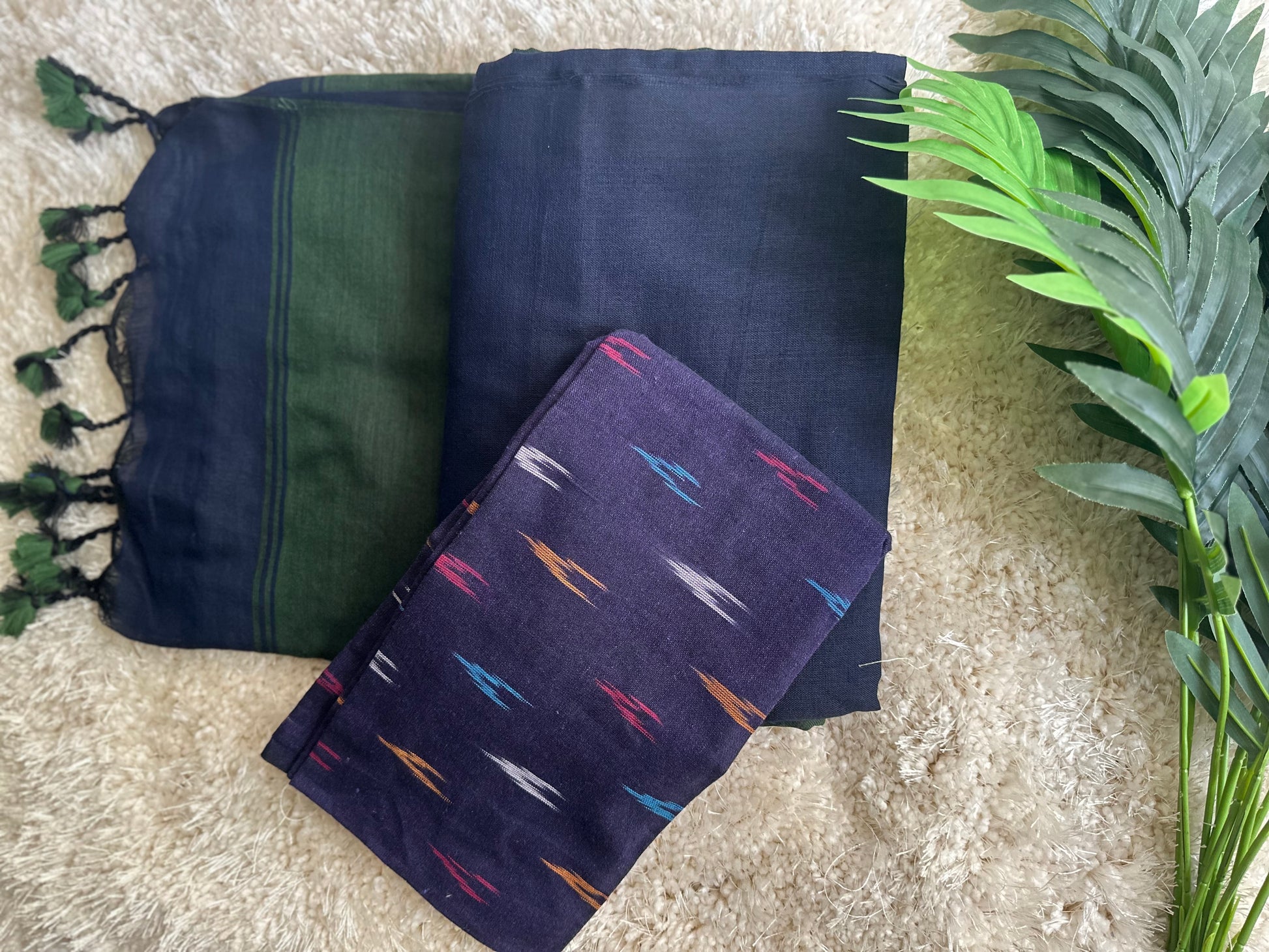 Dark green & blue pure cotton handloom linen saree