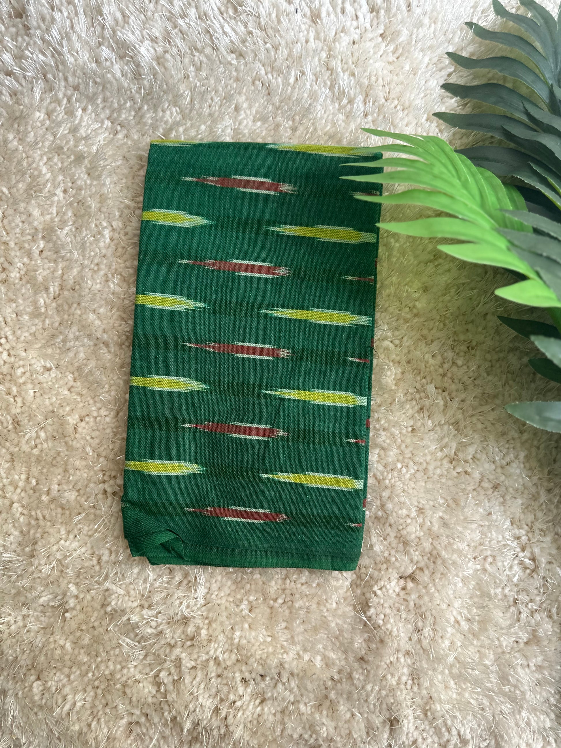 This dark green and blue saree is crafted from pure cotton handloom linen. The expert-crafted ikat blouse lends a sophisticated look to the ensemble. Enjoy comfortable, chic style with this luxurious handloom linen saree.