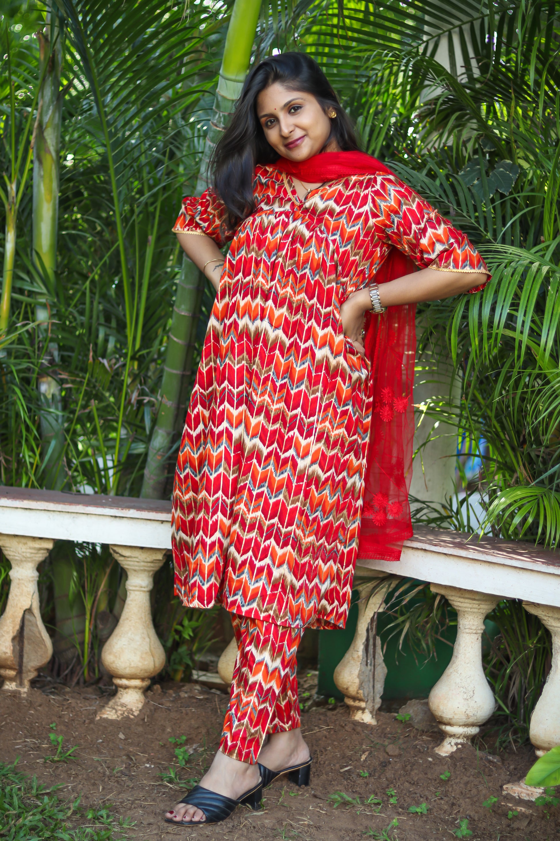 Crafted with precision and elegance, the Red Alia cut kurta set is a stunning piece that combines traditional design with modern flare. The set includes a designer net dupatta, adding a touch of luxury to the outfit. Perfect for special occasions, this set is sure to make a statement and turn heads.