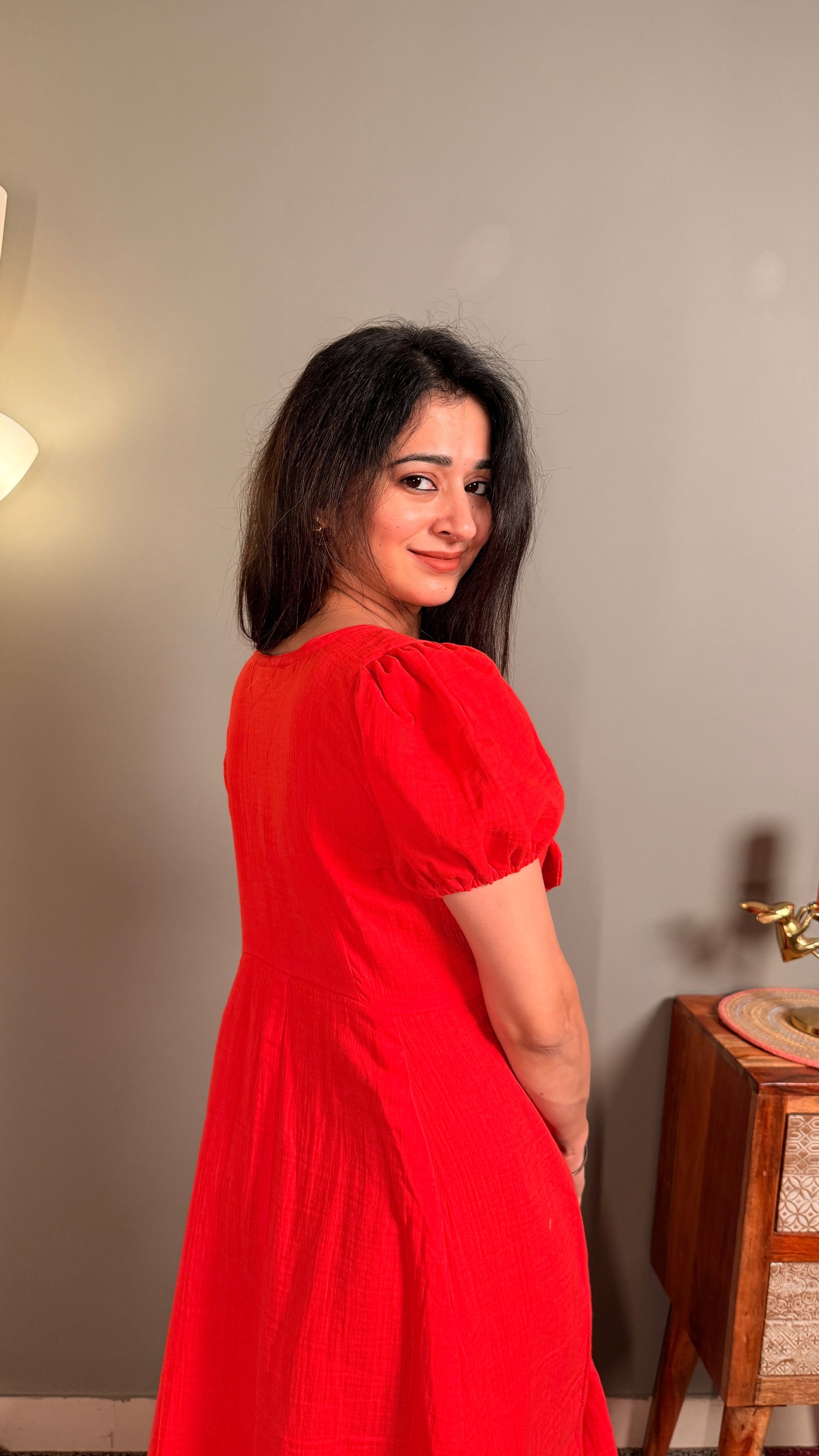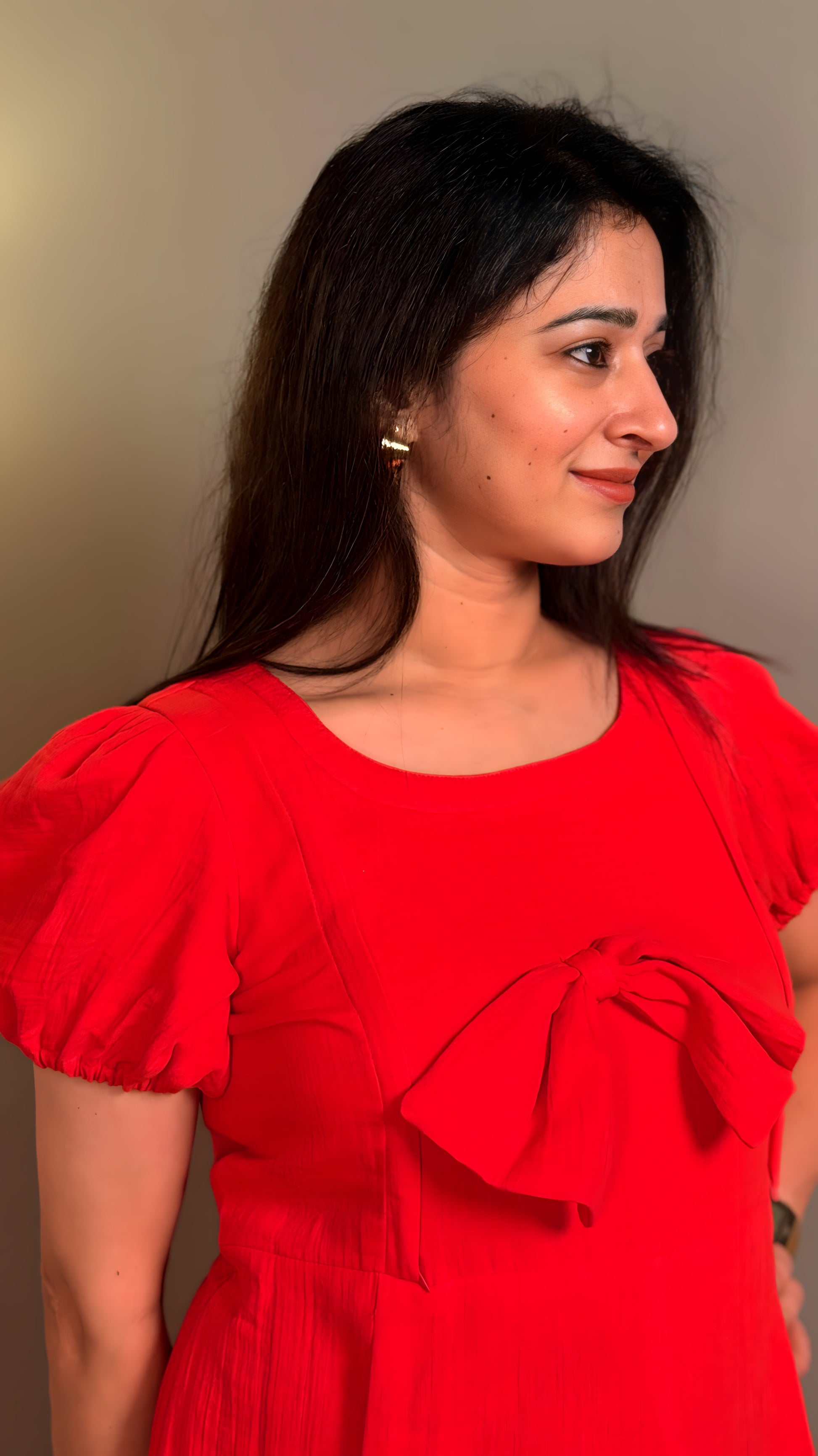 This Scarlet Red maternity maxi, crafted from pure cotton muslin, ensures breathability and comfort during pregnancy. Its soft fabric gently embraces your skin, promoting ease of movement. Featuring a charming bow tie design and elegant sleeves, it combines style with functionality to keep you looking and feeling your best throughout your maternity journey.